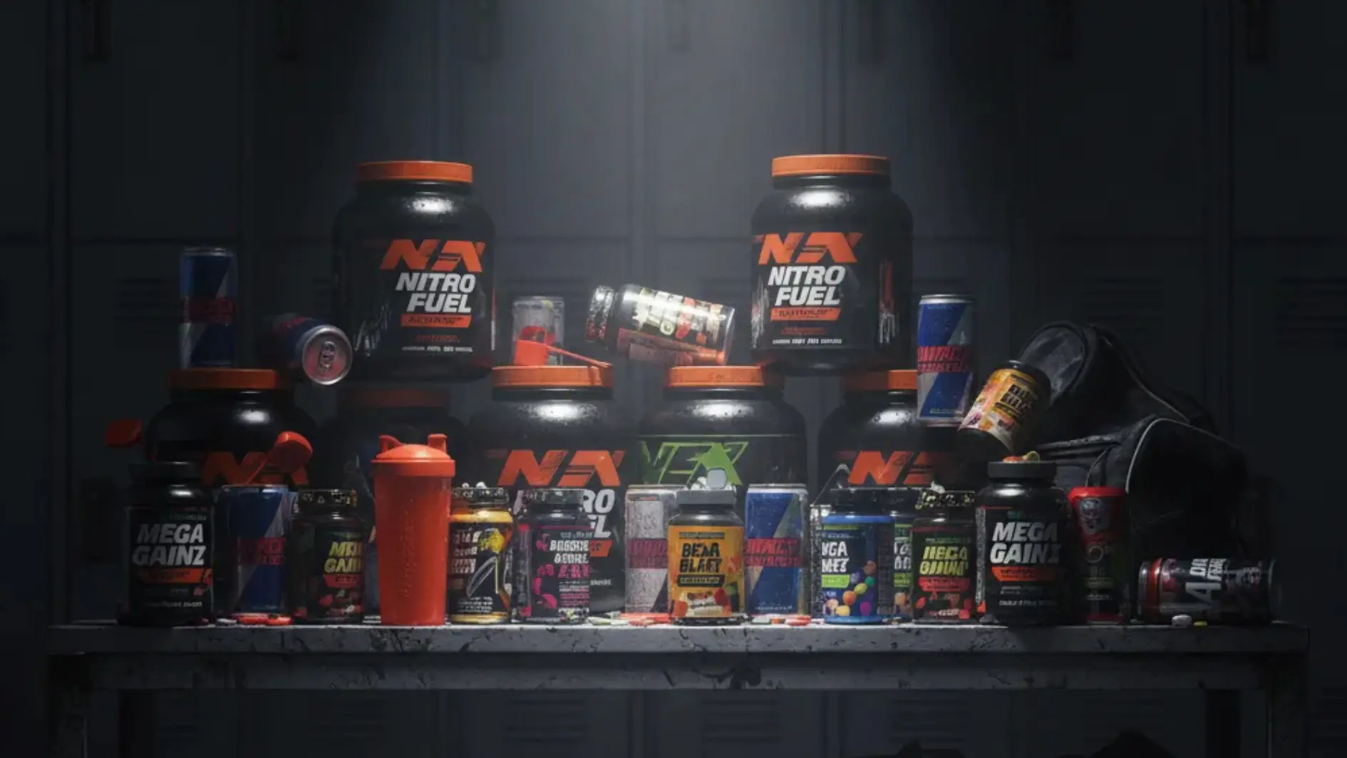 Gym locker room shelf filled with energy drinks, pre-workout tubs, and supplement bottles
